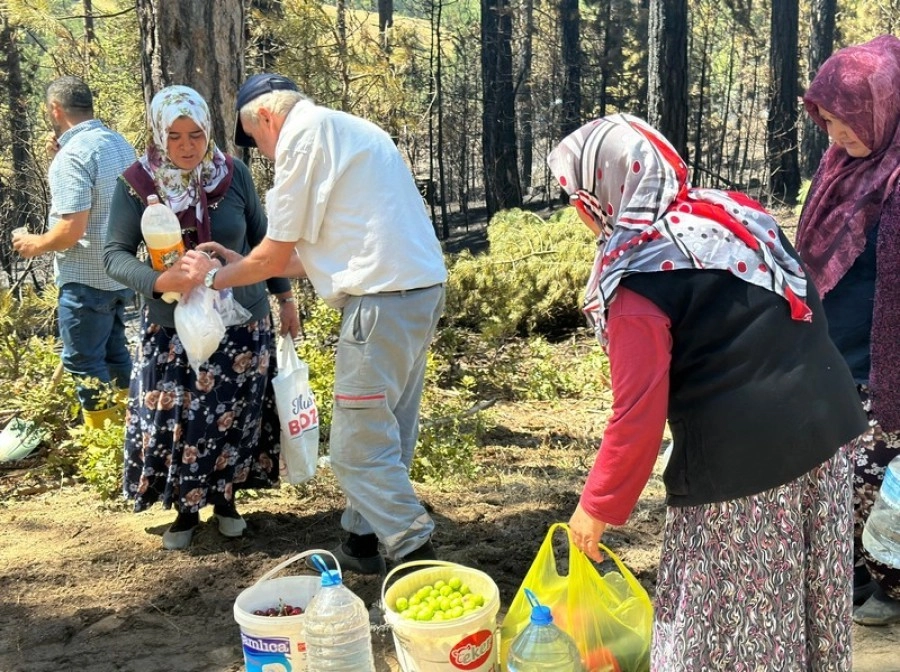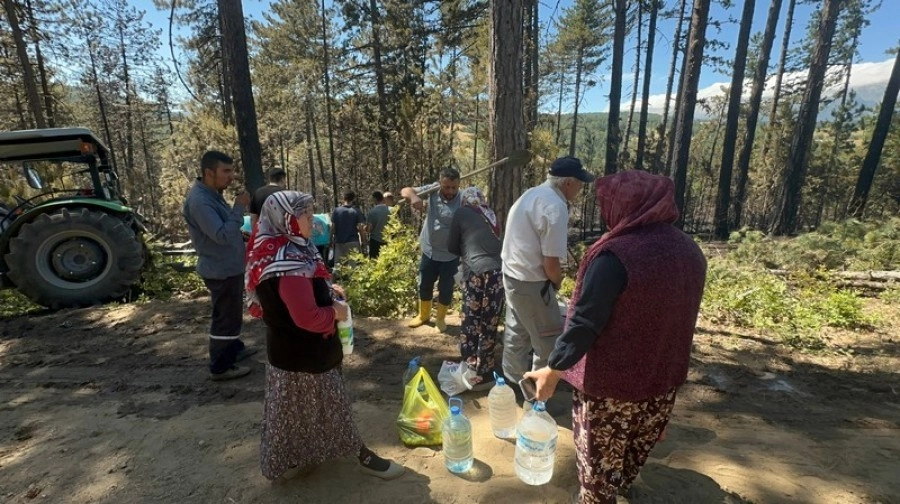 Baraklı Mahallesi'nde yaşayan köylülerden kimi kendi traktörü ile söndürme çalışmalarına destek verdi. Kimi de eline kürek alarak çalışmalara kaldı. Köylü kadınlar ise evde yaptıkları ayranlar bahçelerinden topladıkları erik ve kirazlar ile yangın bölgesine giderek ekiplere ikramda bulundu. Eşinin de itfaiyeci olduğunu ifade eden Azime Ay, "Bende boğazları yanmıştır, dumandan etkilenmişlerdir diye kiraz ile su getirdi. Eşimde itfaiyeci. Bursa şehir merkezinde yaşıyorum. Burada kiraz bahçemiz var. Yangını duyunca yardımımız olsun diye koştuk geldik. Tüm ekiplere kiraz ve su veriyorum" dedi. Öte yandan, yangının etkilediği ağaçlık alan dron ile havadan görüntülendi. Yangının kesin çıkış nedeni araştırılıyor. İHA