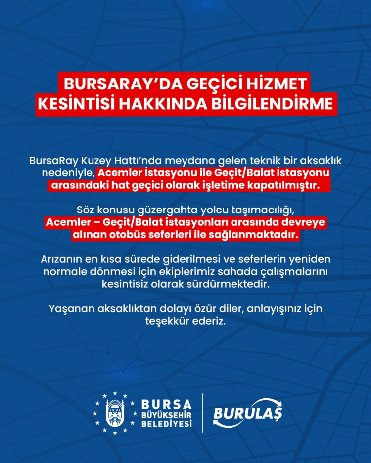 BURULAŞ, BursaRay Kuzey Hattı’nda yaşanan teknik arıza nedeniyle Acemler ile Geçit/Balat istasyonları arasındaki seferlerin geçici olarak durdurulduğunu, ulaşımın otobüslerle sağlandığını duyurdu.