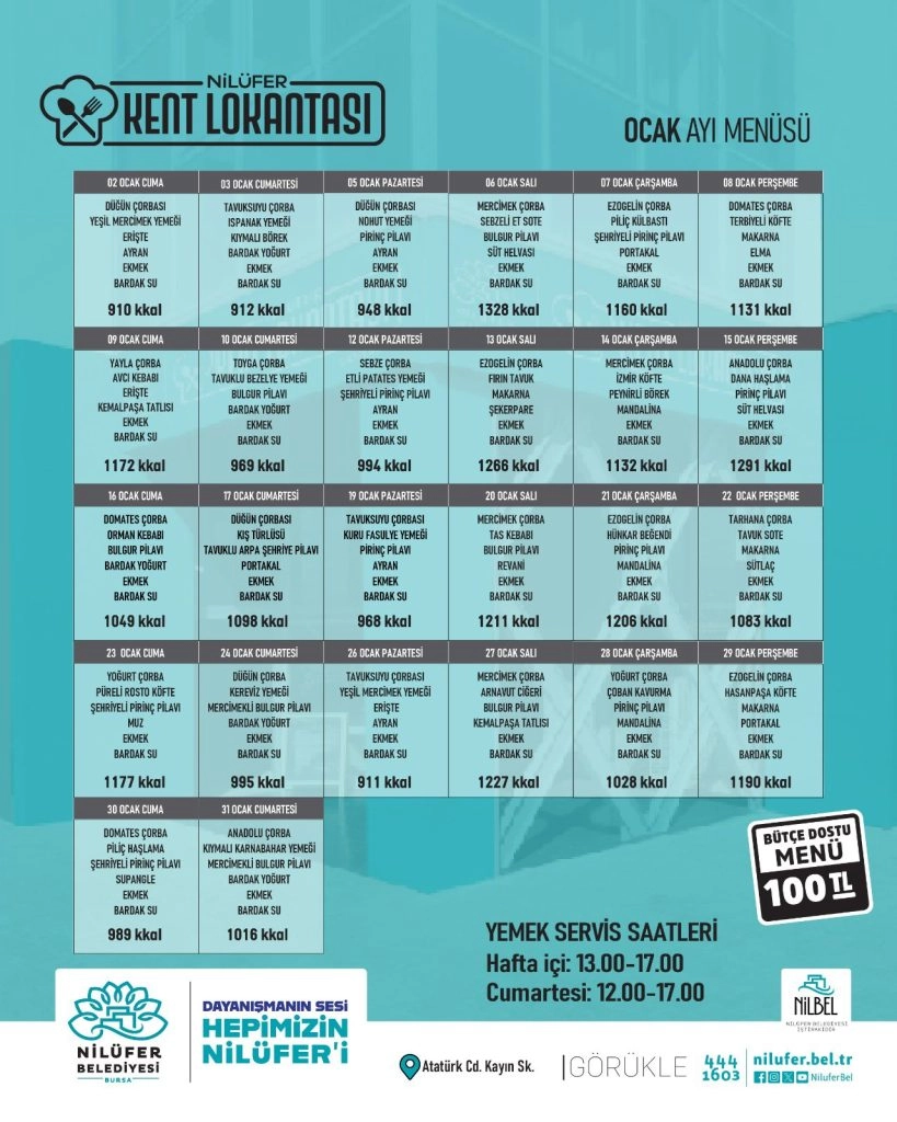 Nilüfer halkının ucuz ve sağlıklı yemeğe ulaşımı için hayata geçirilen Kent Lokantası, Görükle Mahallesi Atatürk Caddesi Kayın Sokak, Bursa ÇEK Kız Öğrenci Yurdu altında hizmet veriyor. Pazar hariç haftanın 6 günü saat 13.00 ile 18.00 arasında vatandaşlara hizmet verilen olan lokantada, 4 çeşit yemek yurttaşlara sunulurken, aynı anda 52 kişi ağırlanabiliyor.En Çok Okunan Haberler