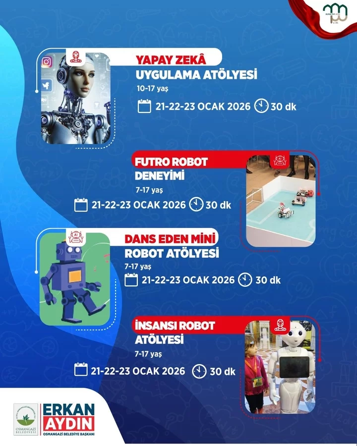 Osmangazi Bilim Şenliği'ne katılan çocuklar ve gençler; sanal gerçeklik uygulamalarından robotik kodlama atölyelerine, çeşitli yarışmalardan atölye çalışmalarına kadar birçok etkinliğe katılarak teknoloji dolu bir gün geçirme fırsatı bulacak. Etkinlik kapsamında robotik kodlama uygulamaları, astronomi, uzay temalı çalışmalar, kağıt sanatları, akıl ve zeka oyunları ile bilimsel içerikli birçok atölye yer alacak.