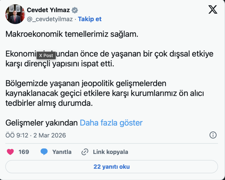 Ortadoğu'da yaşanan gelişmelerin Türkiye ekonomisine etkisinin sert olması beklenirken Cumhurbaşkanı Cevdet Yılmaz, sosyal medya hesabından açıklama yaptı.