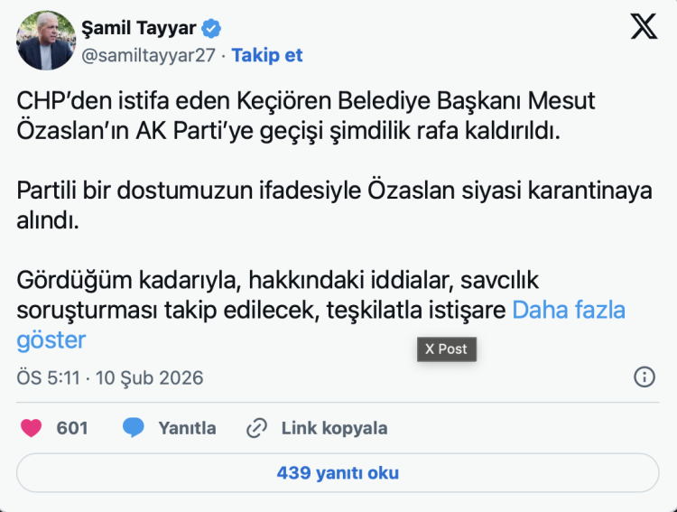 Eski AKP Milletvekili Şamil Tayyar, sosyal medya hesabından yaptığı açıklamada, CHP'den seçilmesine rağmen istifa edip AKP'ye geçeceği söylenen Keçiören Belediye Başkanı Mesut Özarslan'ın AKP'ye geçişinin hakkında açılan soruşturma sebebiyle rafa kaldırıldığını belirtti.