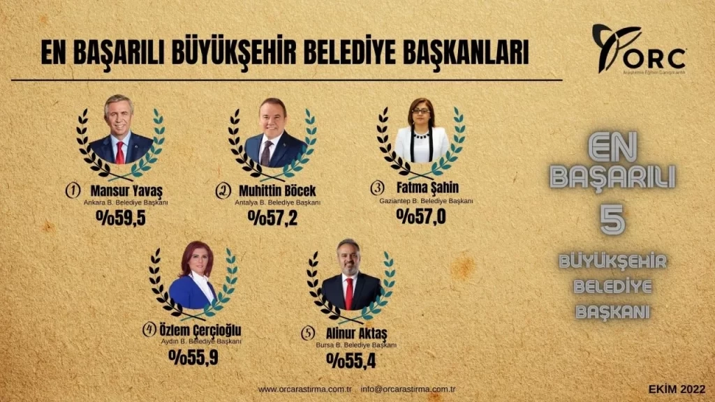 Listenin başında yüzde 59,5'lik oyla Ankara Büyükşehir Belediye Başkanı Mansur Yavaş yer aldı. İkinci sıranın sahibi yüzde 57,2 ile Antalya Büyükşehir Belediye Başkanı Muhittin Böcek oldu. Listenin ilk 5'ine giren ilk AK Partili ise Antep Büyükşehir Belediye Başkanı Fatma Şahin oldu. Vatandaşların Şahin'den memnuniyet oranı yüzde 57. Yüzde 55,9'la, listenin 4. sırasında Aydın Büyükşehir Belediye Başkanı Özlem Çerçioğlu yer aldı. İlk 5'in son ismi de AK Partili Bursa Büyükşehir Belediye Başkanı Alinur Aktaş oldu. Ankete katılan vatandaşların yüzde 55.4'ü Aktaş'ı başarılı buldu.