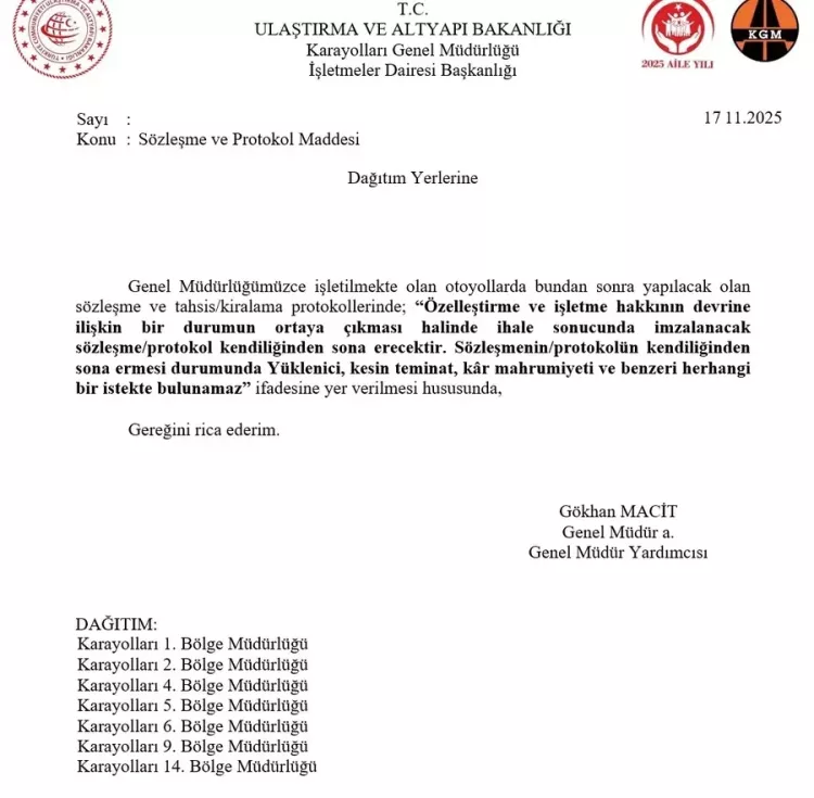 Ulaştırma Bakanlığı, 17 Kasım'da tüm bölge müdürlüklerine bir yazı gönderiyor: "Otoyollarda yeni sözleşme yapacaksanız şu maddeyi ekleyin: özelleştirme olursa sözleşme kendiliğinden düşer, tazminat da isteyemezsiniz."