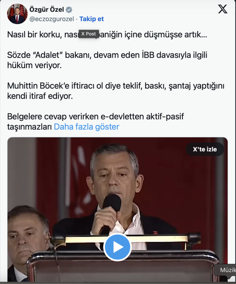 Gürlek'in, kendisini Muhittin Böcek'ten rüşvet almakla suçlamasına da yanıt veren CHP lideri, "Muhittin Böcek’e iftiracı ol diye teklif, baskı, şantaj yaptığını kendi itiraf ediyor" derken konuyla ilgili 30 Ekim 2025 tarihinde yaptığı konuşmanın bir kesitini paylaştı.