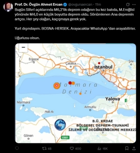 Prof. Dr. Ahmet Ercan, yaşanan depreme ilişkin sosyal medya hesabından bir değerlendirmede bulundu ve “Bugün Silivri açıklarında M6,2’lik deprem odağının bu kez batıda, Marmara Ereğlisi yönünde M4,0 en küçük boyutta deprem oldu. Sönümlenen Ana depremin artçısı. Her şey olağan, kaçışmaya gerek yok.” ifadelerini kullandı.