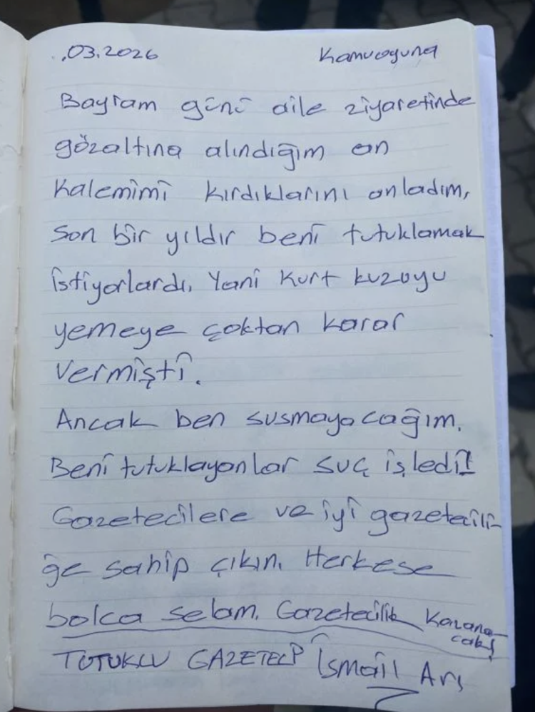 Aile ziyareti için gittiği Tokat'ta gözaltına alınarak Ankara'ya getirildikten sonra tutuklanan BirGün muhabiri İsmail Arı, cezaevinden yurttaşlara seslendi.