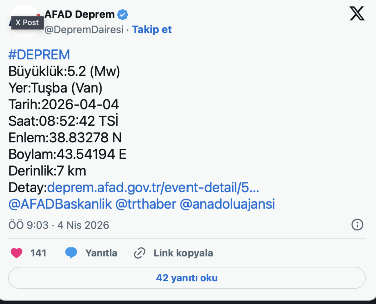 İçişleri Bakanlığı Afet ve Acil Durum Yönetimi Başkanlığı (AFAD) Deprem Dairesi'nin verilerine göre saat 08.52'de Van'ın Tuşba ilçesinde 5.2 büyüklüğünde deprem meydana geldi.