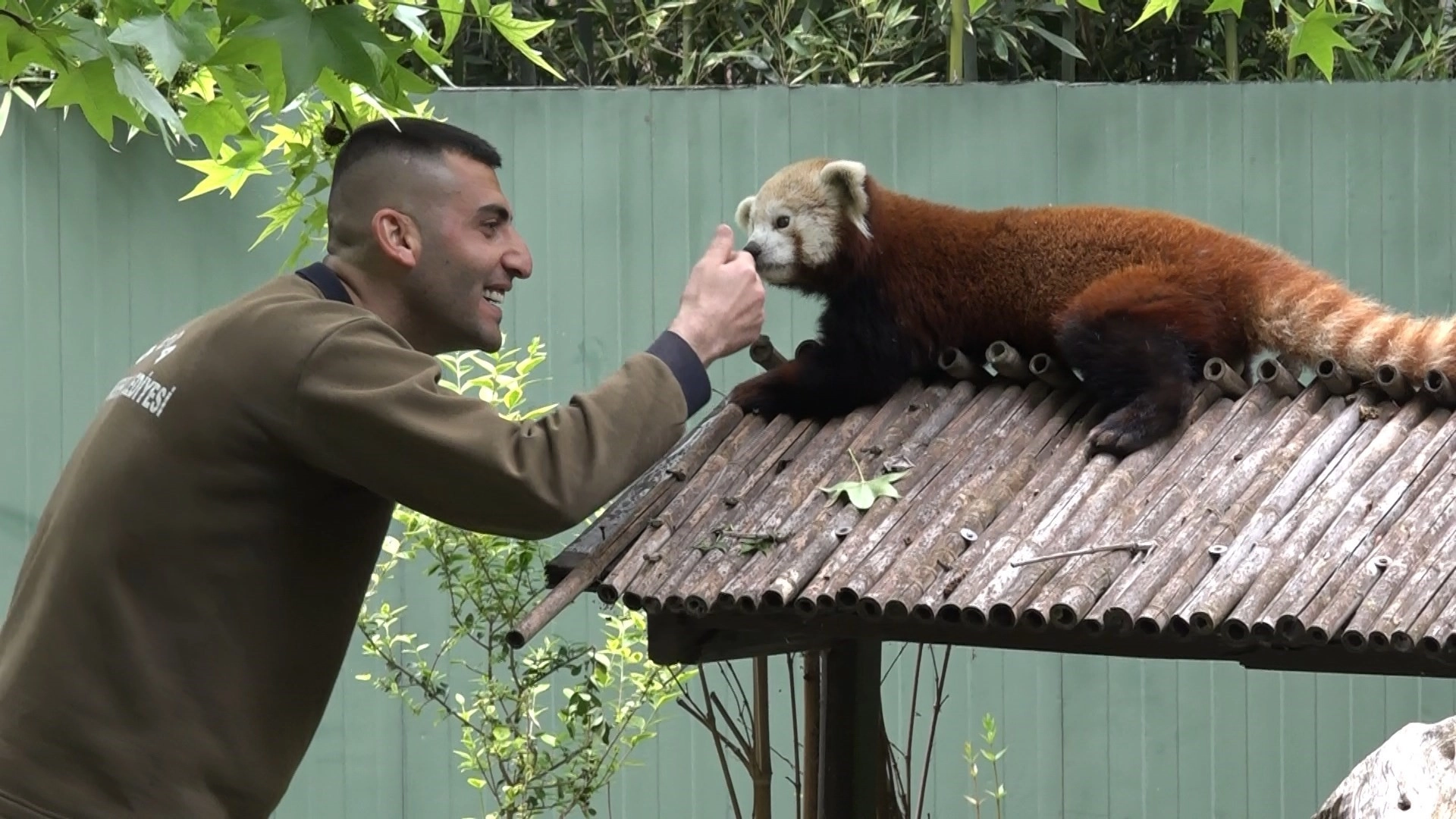 Bursa Hayvanat Bahçesi'nde kızıl pandaların bakımını gerçekleştiren Yasin Yurtlu, “Bambi 1 aydır bizimle beraber. İlk geldiğinde 20 günlük bir karantina süresi vardı. 10 gündür kendi alanına saldık. Diğer arkadaşıyla beraber zaman geçiriyor. Sabahları daha aktif hayvanlar, öğlenleri biraz daha ağır uyku modunda geçiyor. Günde 1 öğün yem veriyoruz. Elma, armut, muz ve ayrıyeten bambu ağaçlarıyla besleniyorlar. Sıcak havalarda klimalı odaları var 25 dereceden sıcak havalarda klimalı odalarını kullanıyorlar. Çok fazla zıplayan bir hayvan olmadığı için alanı bu şekil açık.