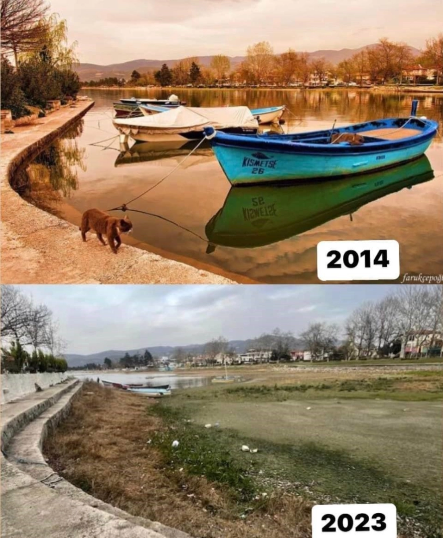 Dron ile çekilen görüntülerde, gölde ne kadar çok çekilme yaşandığı gözler önüne serilirken, eskiden su üzerindeki iskele ise toprağın üzerinde kaldı. Öte yandan göldeki çekilmenin boyutu da 8 ve 9 sene önce çekilen ve bugün aynı noktadan çekilen karşılaştırmalı fotoğraflarla bir kez daha günyüzüne çıkarıldı.