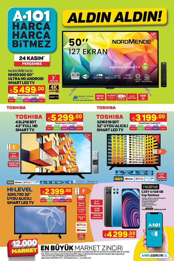 İlk ürün grubunda Televizyonlar var. İlk sayfayı dolduran TV’lerin ilkinde 4K ekranı ve HDR10 desteğiyle gelen NordMende 50″ Ultra HD Android Smart Led Tv 5.499 TL fiyatla sizleri bekliyor. Bu ürünü takip eden fırsat Toshiba 43″ Full HD Smart Tv 5.299 TL olarak devam ediyor. Ayrıca aynı markaya haiz olarak Toshiba 32″ Uydu Alıcılı Smart Led Tv 3.199 TL’den sizlerle. Daha uygun fiyatlı ve daha küçük ekranlı bir TV için HI-LEVEL 32″ Uydu Alıcılı Smart Led Tv 2.399 TL fiyatla raflarda. Bu haftanın akıllı telefonu ise Realme ile geliyor. Realme C25Y 4/128 GB Cep Telefonu 4.299 TL fiyatla sizlerle. Detayları pek tabi aktuel-urunler.com ile görebilirsiniz. Sonraki katalog ile indirimleri ele almaya devam edelim. Bu haftanın ikinci sayfasında ankastre ve bir de termosifon var. Goodwest Inox Ankastre Set 2.999 TL gibi inanılası güç bir fiyatla sizlerle. Ocakların doğalgaz uyumluluğu olduğu ve LPG dönüşümünün ücretle yapıldığını belirten katalog ayrıca 2 yıl garanti etiketi de sunuyor. GW1413 ocak, GW 1412 davlumbaz ve GW 1414 fırından meydana gelen ankastre set kaçmaz. Bir sonraki A101 24 Kasımürününde SEG Mekanik Silindirik Termosifon var. Ürün 2.199 TL’den satılacak. 24 Kasım 2022 tarihi itibarıyla geçerli olacak olan ve müthiş kampanyalar sunacak olan 3. sayfada yok yok. İlk ürün 3 aylık Game Pass hediyesiyle geliyor. Ürün Lenovo N4120 4/128 GB Notebook 4.999 TL’den satılıyor. 128GB SSD, 4GB RAM ve 15,6 inç ekranla gelen ürün Win11 Home işletim sistemli. Fırsat listelerinde akıllı saat Vestel’den… Vestel Akıllı Saat 499 TL’den sizlerle. Devamında bir de Router var. Mercusys MW306R Router 239 TL. Son teknoloji ürünlerde GoSmart Bluetooth Kulaklık 119 TL, Piranha Klavye Mouse Seti 99,95 TL ve Xiaomi Mi Tv Stick 4K 1.099 TL’den geliyor. Aktüel Ürünler A101 kataloglarında Piranha ürünleri de boy gösteriyor. Piranha USB Kablo 19,95 TL, Piranha Duvar Şarjı 49,95 TL ve Piranha 2281 Spor Bluetooth Kulaklık 69,95 TL2den sizleri bekliyor. Alıcısına sunulan Osram Led Ampul 19,95 TL, Akel AF380 Midi Fırın 699 TL ve Kiwi KJ1950 Yavaş Sıkım Sebze Meyve Sıkacağı 499 TL’den geliyor. Mutfakta elektronik aletler ve çeşitli ev elektroniği ürünlerinde de indirim 24 Kasım A101 kataloğuyla birlikte geliyor. Schafer Chef Mix Multi Blender Seti 639 TL’den, Kiwi KTM 2907 Çay Makinesi 289 TL ve Kiwi KHB 4415 Çubuk El Blender’ı 169 TL’den sizlerle oluyor. Aprilla AHC 5026 Şarjlı Saç ve Sakal Düzeltme Makinesi 149 TL fiyatla raflarda yer edinirken bu hafta Aprilla ABS 1027 Dijital Banyo Baskülü 119,90 TL’den satılıyor.