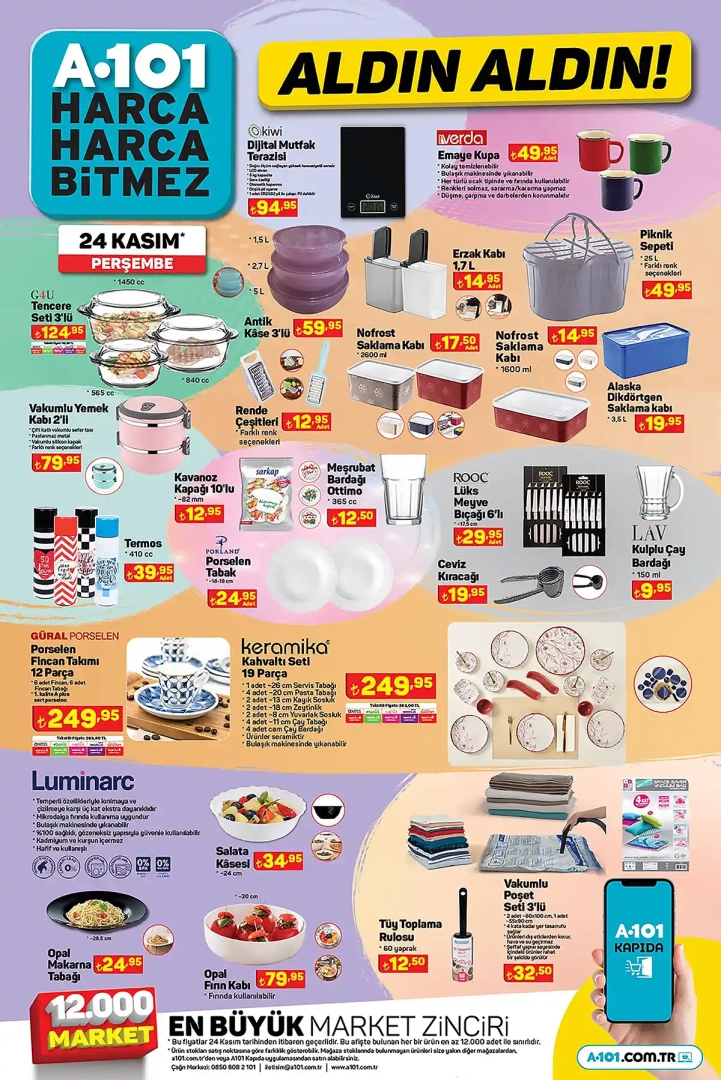 24 Kasım Perşembe A-101 aldın aldın kataloğunun yeni kampanya döneminde geçerli olacak indirimli ürünlerinin detaylarını incelemeye başladığımızda yine harika ürünlerle donatılmış olan bir katalog karşımıza çıkıyor. Aktüel ürünler, alışverişçilerin vazgeçilmezi A101 Aktüel fırsatlarını tek tek ele alıyor. Kesinleşmiş olan indirim listelerinde A101 24 Kasım 2022 kampanyaları büyük bir coşkuyla karşılanıyor.