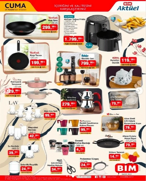 Bim 25 Kasım 2022 aktüel kataloğunun yeni kampanya döneminde geçerli olacak indirimli ürünlerinin detaylarını incelemeye başladığımızda yine harika ürünlerle donatılmış olan yeni Bim kataloğu karşımıza çıkıyor. Bu cuma BİM’de indirimde neler var? sorusunun günlerdir merak edilen cevaplarının yer aldığı 25 Kasım 2022 BİM kataloğu içeriğinde bu hafta yer alan ürün grupları; Teknoloji ürünleri, Elektronik ürünler, Elektrikli mutfak ürünleri, Züccaciye ve mutfak ürünleri, Tekstil ve Giyim ürünleri, Eğitici ve öğretici özellikleri ile çocuklarınızı mutlu edebileceğiniz harika oyuncaklar bu hafta Bim Aktüel Kataloğu ürün gruplarını oluşturduğunu görüyoruz.
