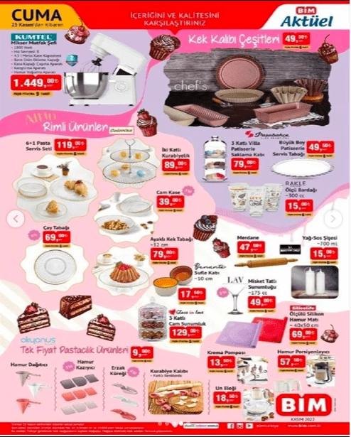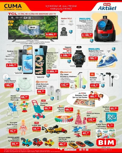 Bu Cuma BİM'de sizlere sunulacak yeni dönemde geçerli fırsat ürünlerinin yer aldığı 25 Kasım Bim aktüel kataloğunun indirimli ürünleri devamında; Fakir Dijital Baskül 199 TL. Polosmart Akım Korumalı 3 USB Tekli Duvar Prizi 99 TL. Şarj edilebilir özelliği, dayanıkılı ve keskin bıçaklı, güçlü ve hızlı motorlu 2 yıl garantili Polosmart Saç ve Sakal Düzeltme Makinesi 129 TL. Dahili mikrofonlu 2 yıl garantili JBL C50 Kulaklık 119 TL. BİM Aktüel 25 Kasım 2022 kataloğunun detaylarında incelemesine devam ettiğimiz ürün grubu eğitici ve öğretici oyuncaklar BİM aktüel kataloğu ile bu hafta indirim reyonlarında sizlere sunulacak. İşte bu ürünler ise; Mama Sandalyesi Oyuncağı 69 TL. Oyuncak Puset 55 TL. Bemi Domino Oyunu 59,50 TL. Rafadan Tayfa Şut ve Gol Oyunu 109 TL. Lelia Oyuncak Bebek Seti 129 TL. Buldum Kutu Oyunu 55 TL. Konuşan Nazlı Bebek 79 TL. İnşaat Seti 59,50 TL. Piccolo Mondi Sürtmel İş Makineleri 39,50 TL. Piccolo Mondi Çek Bırak Metal Yarış Arabası 49,50 TL. LC Helikopter 42,50 TL. Türkçe Tema Hikayeleri 9,75 TL.