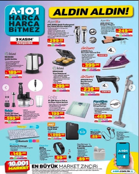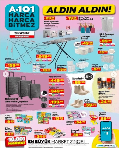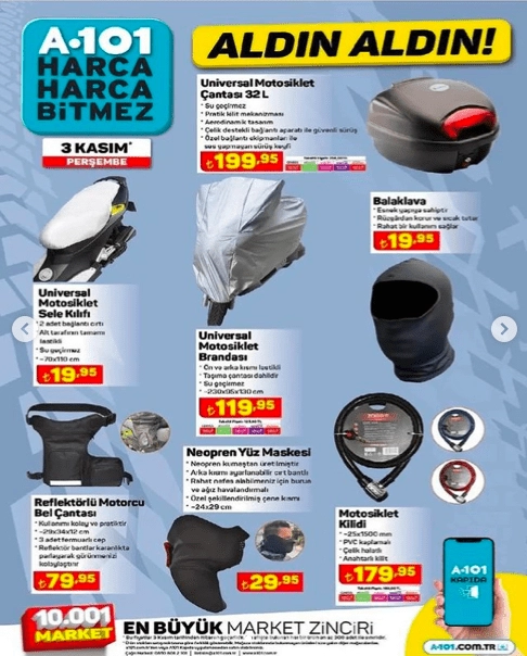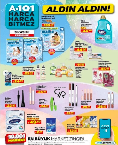 3 Kasım Perşembe A-101 kataloğu yayımlandı. Katalogda motor yardımcı ürünlerinden makyaj malzemelerine birçok indirimli ürün bulunuyor. Ceyizciler dikkat! 3 Kasım Perşembe A-101 kataloğu yayımlandı. 3 Kasım Perşembe A-101 kataloğunda pek çok indirimli ürün bulunuyor. Uzun zamandır beklenen Golgen Rose makyaj ürünleri de bu katalogda. Türkiye'nin en büyük perakende market zincirlerinden A101  Aldın Aldın katalog listeleri yayınlandı. Bursa'dan Ardahan'a her ilde ve ilçede olan A101'in aktüel kataloğu yayımlandı.  A101 kataloğundaki birbirinden cazip indirimleri kaçırmamak için güncel A101 broşür içeriklerimizi takip edebilirsiniz.