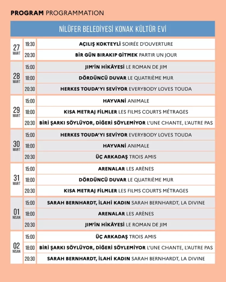 Nilüfer Belediyesi Konak Kültürevi'nin ev sahipliği yapacağı festival, 27 Mart günü açılış kokteyli ile başlayacak. Açılış filmi, aynı zamanda geçen yıl Cannes Film Festivali'nin açılış filmi olan "Bir Gün Bırakıp Gitmek" olacak. Gösterim kokteyl sonrası gerçekleşecek.